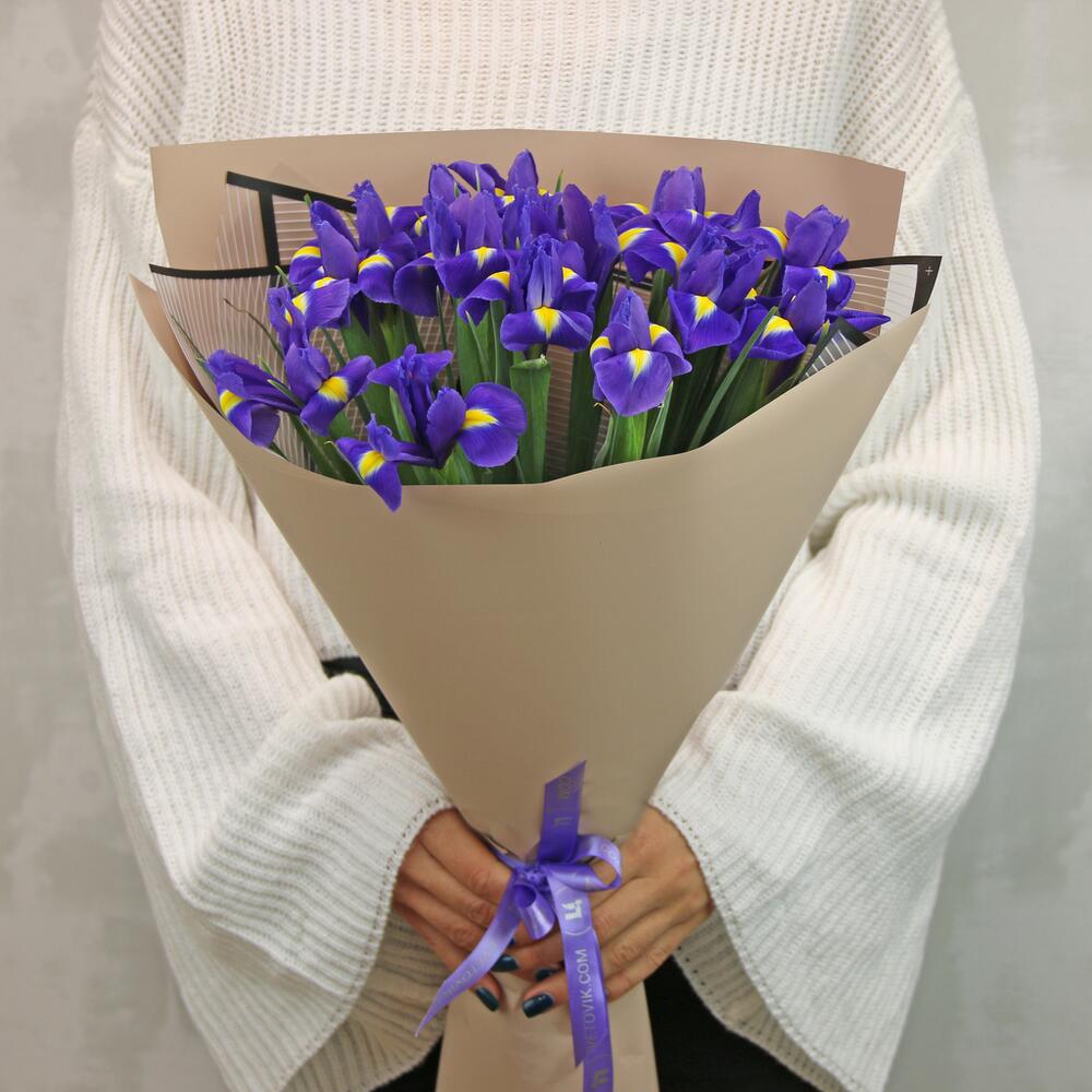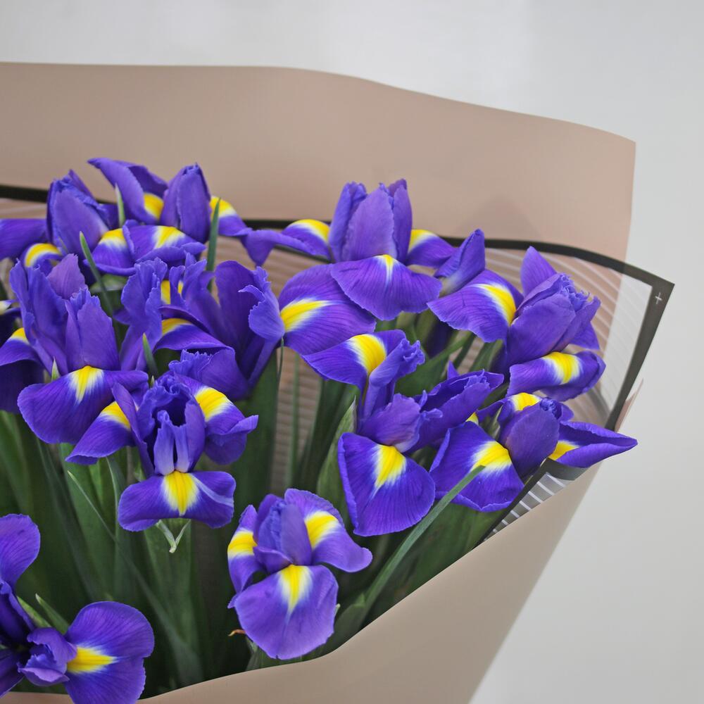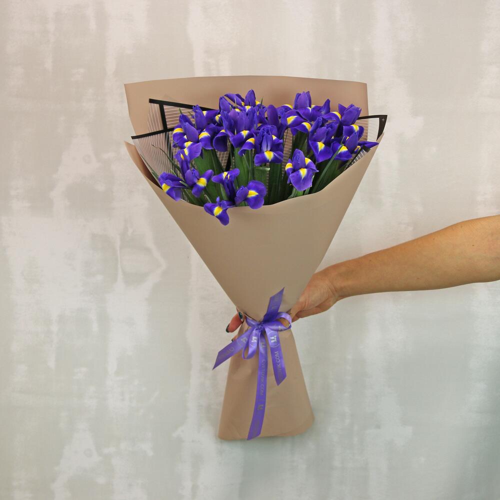 Букет из 15 синих ирисов в стильной упаковке