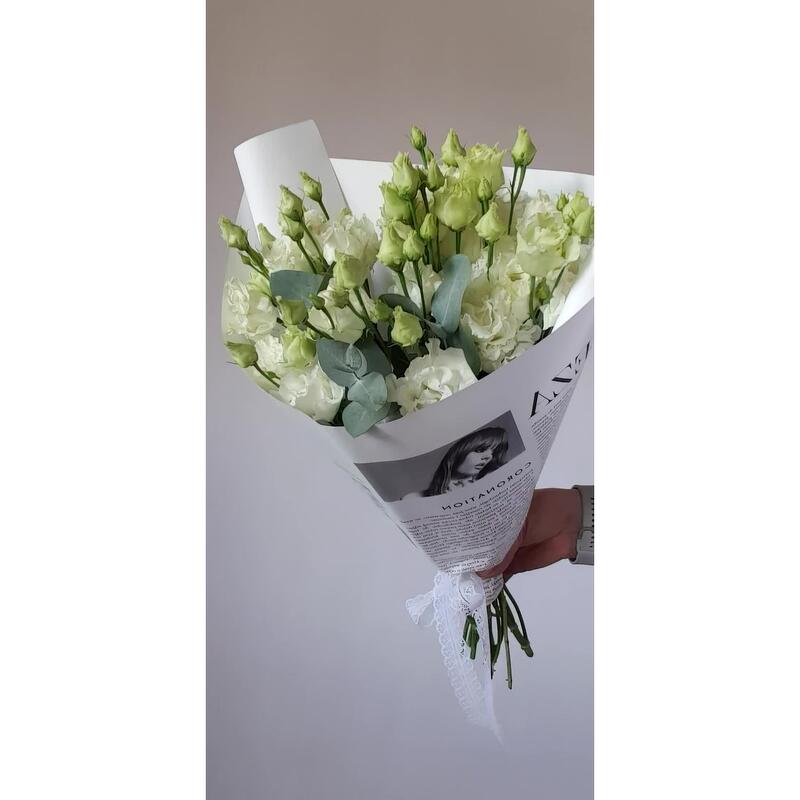 Лента – 1 шт.Эвкалипт – 3 шт.Упаковка – 2 шт.Лизиантус белый – 5 шт.