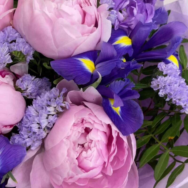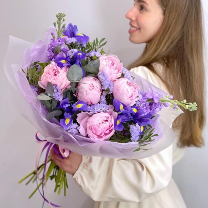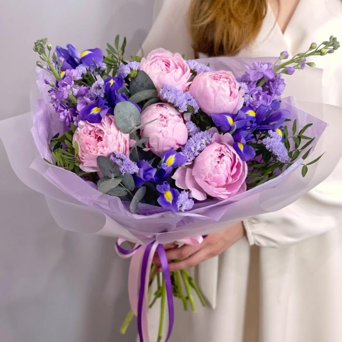 Ирис – 5 шт.Маттиола – 2 шт.Статица – 1 шт.Эвкалипт – 2 шт.Фисташка – 2 шт.Упаковка дизайнерская – 1 шт.пионы сара бернар – 5 шт.