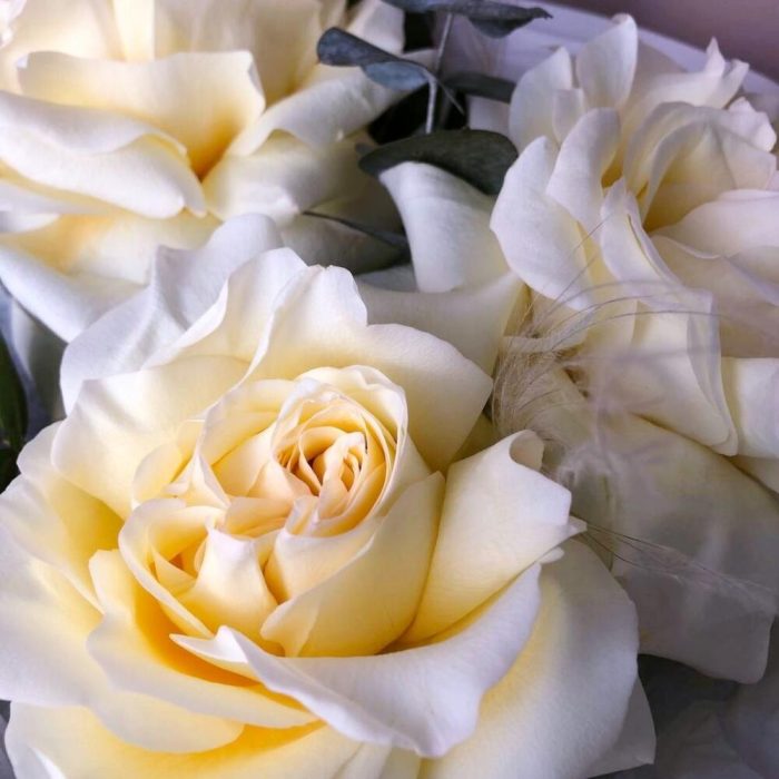 Эвкалипт – 3 шт.Лента атласная – 1 шт.Роза французская – 3 шт.Ковыль – 3 шт.пленка флористическая – 3 шт.подкормка для стойкости цветов – 1 шт.открытка для пожеланий – 1 шт.