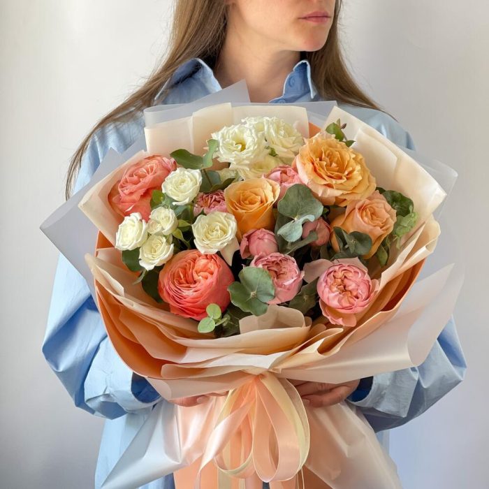 Лента – 1 шт.Роза кустовая – 2 шт.Эвкалипт – 1 шт.Роза одноголовая – 5 шт.Упаковка – 2 шт.Роза Джульетта – 1 шт.