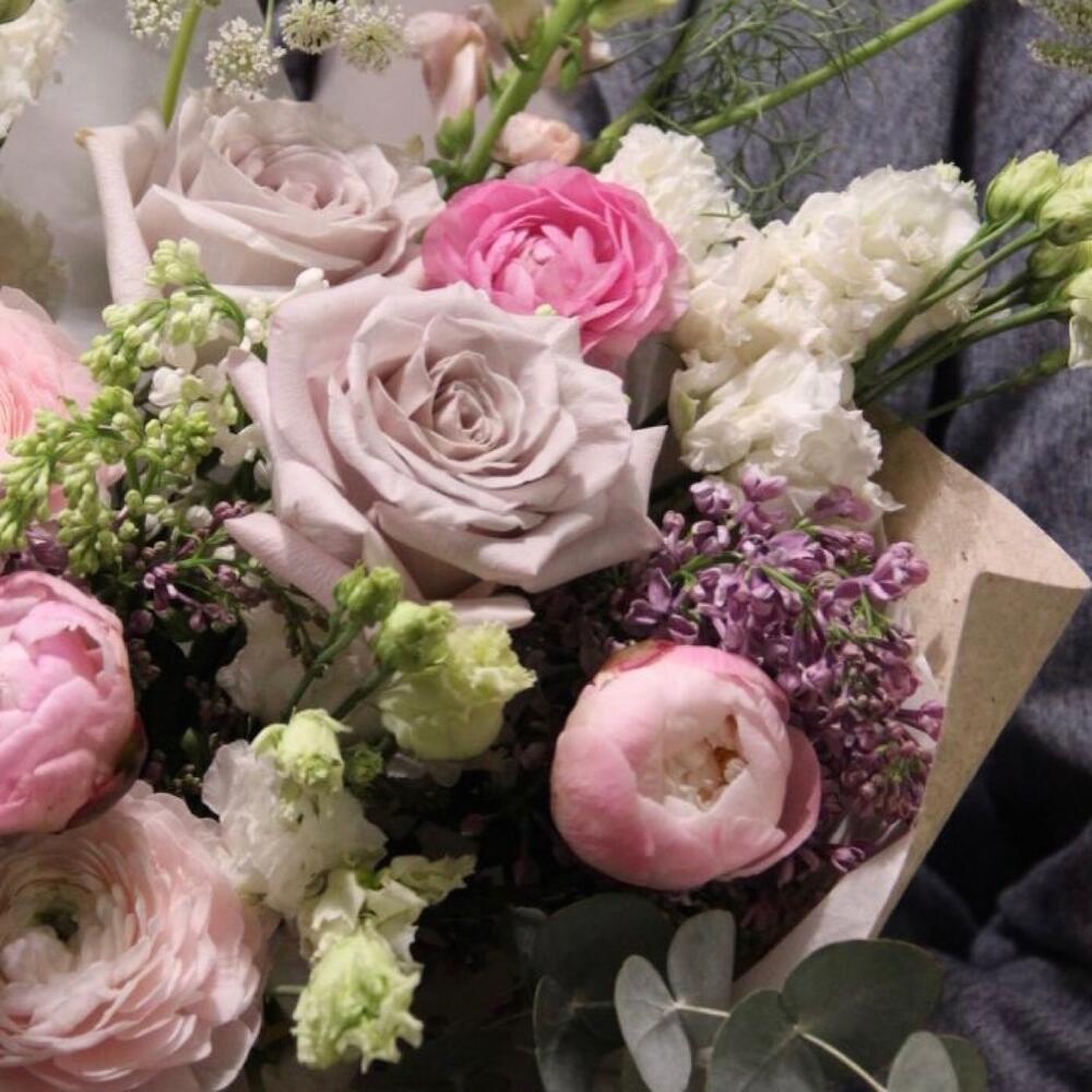 Пион – 3 шт.Сирень – 5 шт.Ранункулюс – 5 шт.Роза сортовая – 5 шт.Лизиантус – 5 шт.Львиный зев – 3 шт.зонтик садовый – 4 шт.Эвкалипт – 7 шт.Упаковка – 1 шт.Лента – 1 шт.