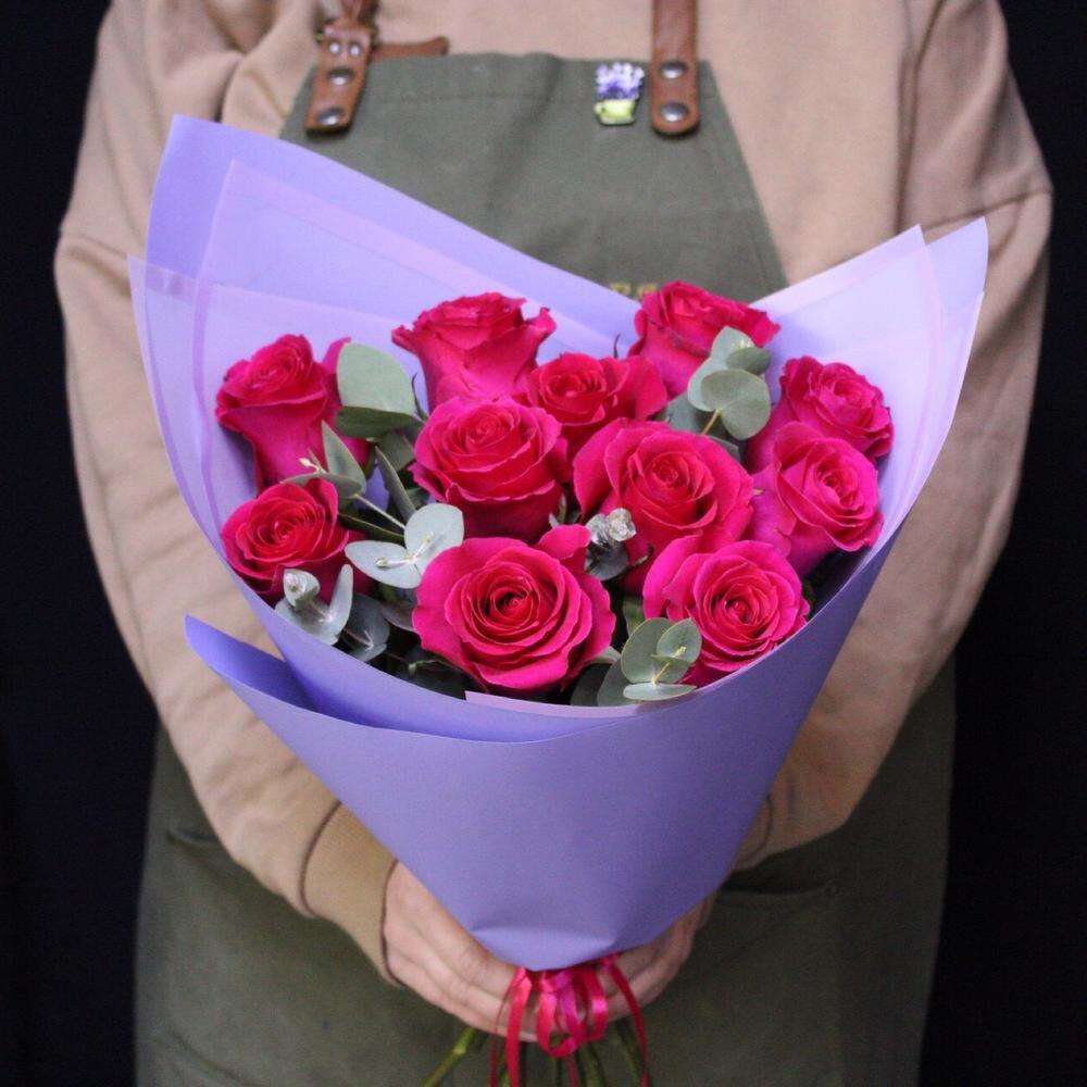 роза эквадор готча – 11 шт.Эвкалипт – 3 шт.Пленка дизайнерская – 3 шт.Лента атласная – 1 шт.