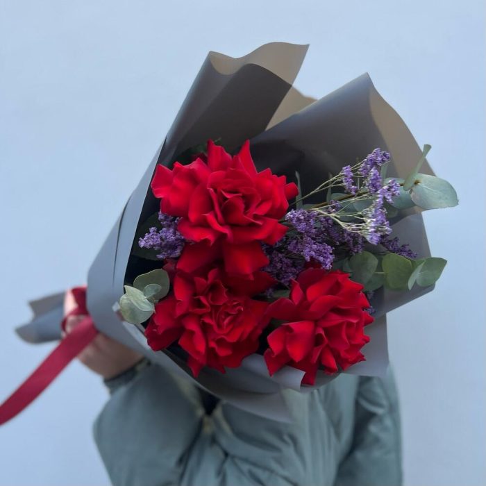 Лимониум – 1 шт.Эвкалипт – 1 шт.Лента атласная – 1 шт.Роза фридом – 3 шт.Пленка матовая – 1 шт.